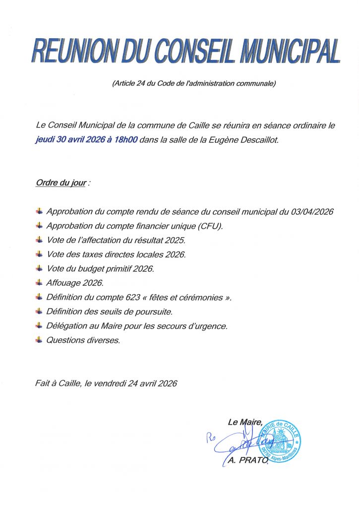 RÉUNION DU CONSEIL MUNICIPAL DU JEUDI 30 AVRIL 2026 A 18H